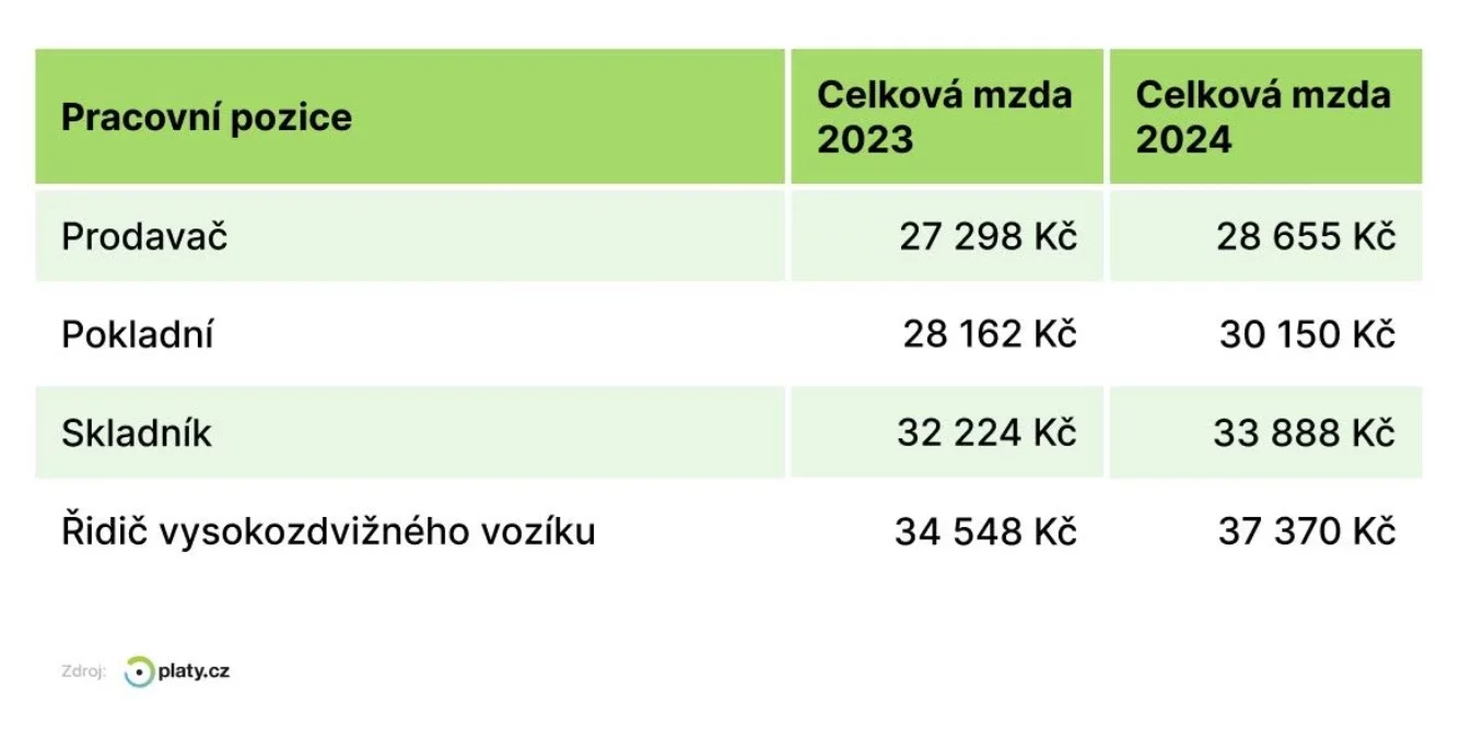Mzdy nabízené prodavačům zde patří dlouhodobě k těm vyšším. Podle serveru Platy.cz loni prodavači průměrně pobírali mzdu ve výši 28 655 Kč a skladníci 33 888 Kč (u profese skladníka u Platy.cz ještě zjišťujeme, o jaký rozsah úvazku se jedná). Na serveru Platy.cz si můžete zadat svou mzdu a porovnat ji s odměnou jiných zaměstnanců na srovnatelných pozicích.