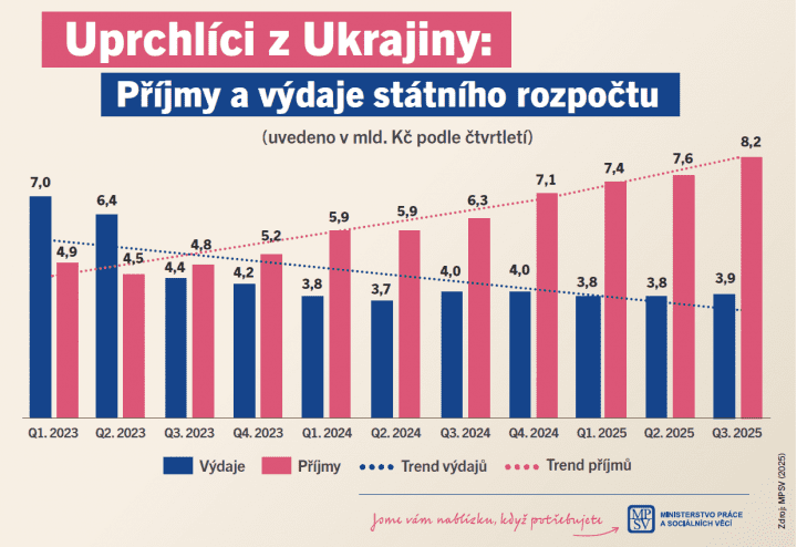 Uprchlíci z Ukrajiny přináší do českého rozpočtu více, než kolik stát vynakládá na jejich pomoc. Informace vyplývají z nových dat Ministerstva práce a sociálních věcí (MPSV). Podle nich výdaje spojené s podporou lidí, kteří k nám z Ukrajiny uprchli kvůli ruské válečné agresi, za třetí letošní kvartál dosáhly 3,9 miliardy Kč. Modelované příjmy do státního rozpočtu z daní a odvodů osob s dočasnou ochranou by ale měly činit rovnou 8,2 miliardy Kč. Jde tedy o 4,3 miliardy korun ve prospěch státního rozpočtu.