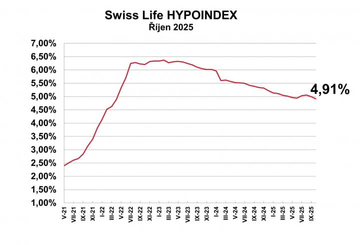 Hypoteční sazby během října klesly nejvíce od začátku roku. Průměrná nabídková sazba klesla o 0,08 procentního bodu na 4,91 % p. a., což je nejnižší hodnota od dubna 2022. Informace vyplývají ze zprávy o vývoji ukazatele Swiss Life Hypoindex.
