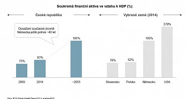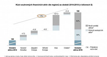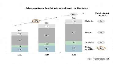 Finanční aktiva českých domácností rostla v posledních pěti letech o 6 % ročně, tedy o 2 % pomaleji než celosvětový průměr, pomaleji než například domácnosti v Polsku a na Slovensku (oboje 8 % ročně).