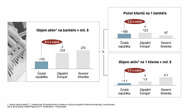 Privátní bankéři v ČR spravují průměrně 110 milionů dolarů aktiv. To je podle studie zhruba poloviční objem než jejich kolegové v západní Evropě. Na jednoho klienta připadá v ČR 1,1 mil. USD oproti západní Evropě s 1,9 mil. USD.