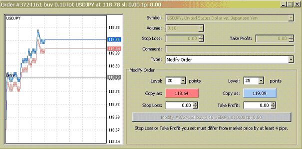 Nyní je třeba zadat ještě příkazy pro automatický prodej (nebo sedět u terminálu a hlídat vývoj kurzu sami). Prodej naplánujeme tak, že pokud kurz stoupne (Profit Target) o 25 pips, vystoupíme se ziskem, pokud klesne o 20 pips, provede se ochranný prodej, který nás uchrání před velkou ztrátou (Stop Loss). Příkazy můžeme zadávat rovnou s objednávkou, nebo dodatečně tak, že klikneme pravým tlačítkem myši nad údaji objednávky.