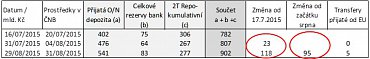 Kumulovaný nárůst objemu peněz bank u ČNB od 17.7.2015 (kdy byly dle ČNB zahájeny poprvé intervence) ve výši 120 mld. Kč je tak pravděpodobně způsoben ve velké míře právě intervencemi ČNB, zatímco na poslední dva červencové týdny připadalo zhruba 20 mld. Kč., v samotném srpnu se dle našich odhadů intenzita intervencí znásobila a dosáhla 90 mld. Kč (viz tabulka).