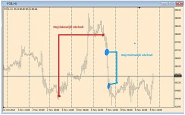 Soutěžící koupil v pondělí 5. listopadu dopoledne, tedy před začátkem prezidentských voleb v USA 0,19 lotu ropy a pozici uzavřel se ziskem 11 470 Kč ve středu v poledne těsně po dosažení jejího cenového vrcholu. Ropa v čase prezidentských voleb přesně kopírovala vývoj USD. Když USD oslaboval, cena ropy stoupala a naopak. Cenový průběh ropy, rovněž i nejziskovější (červeně) a nejztrátovější obchod týdne znázorňuje graf níže.