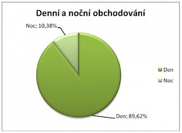 U reálného obchodováni jsme se zaměřili i na srovnání denního a nočního obchodování. 10,38 % transakcí bylo otevřeno v noci (22:00 – 07:00) a 89,62 % transakcí bylo otevřeno přes den.