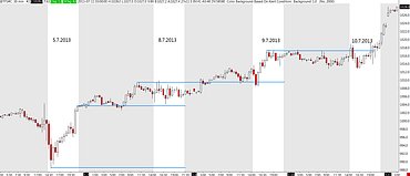 Co vás může překvapit, je skutečnost, že zobrazený trh se z pohledu 30ti minutového timeframe zase tolik nehýbe. Na grafu za poslední dny můžeme vidět, že trh v zásadě stoupá, ale každý den udělá většinou spíše menší pohyb. A co více – trh v jednotlivých seancích často reaguje na hlavní supporty a resistence z předcházející seance (Podrobněji o support a resistancích viz například článek Technická a fundamentální analýza v tradingu Technická a fundamentální analýza v tradingu). Některé z těch nejviditelnějších jsem označil modrou linkou.
