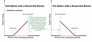 - Knock-out – opce propadne v okamžiku, kdy dosáhne určité úrovně při růstu (up and out) nebo poklesu (down and out) ceny podkladového aktiva,