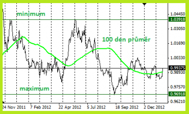 Na grafu je zobrazen vývoj měnového páru USD/CAD v průběhu roku 2012 spolu s orientačně vyznačenými maximy, minimy a 100denním průměrem. Trend vývoje kurzu nebyl v průběhu roku 2012 jednosměrný. CAD ztratil nejvíce ze své hodnoty vůči USD na jaře, kdy kumulovala nejistota ohledně budoucnosti eurozóny, a investoři utíkali k tzv. bezpečným aktivům, což byl v tomto měnovém páru USD.