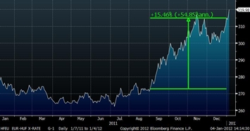 Neradostné vyhlídky Maďarska dobře dokumentuje vývoj kurzu forintu na měnových trzích, který se zvláště v posledních měsících roku blížil volnému pádu. K euru tato měna ztratila v roce 2011 více než 13 % a rok zakončila na 315 forintů za euro – v blízkosti historických minim, které však už stačila na počátku tohoto roku překonat. Vážnost situace zesiluje fakt, že ani společná evropská měna není právě v kondici. O mnoho lepší není ani vývoj kurzu maďarské měny k americkému dolaru. Přestože tam zatím nejsou rekordy na pořadu dne, forint se ke světové rezervní měně pohybuje poblíž desetiletých minim. K zastavení poklesu měny na všech frontách navíc nepomohlo ani trojí zvýšení úrokových sazeb dohromady o 2, 25 % v minulém roce.