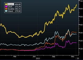 Vývoj pětiletých CDS kontraktů Maďarska, Česka, Slovenska a Polska v roce 2011