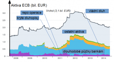 Od března 2015 by tak mělo na nákup dluhopisů každý měsíc ze strany Evropské centrální banky (ECB) směřovat 60 mld. EUR. Program by měl trvat nejméně do září 2016, nebo „dokud neuvidíme trvalé úpravy ve směřování inflace“. Utraceno by mělo být okolo 1,1 bilionu eur, a to už je přece velká suma, aby zamíchala kartami a přinesla hospodářskou spásu. Pokud se ale podíváme na následující graf, zjistíme, že z pohledu celkové velikosti nafouknutého bilančního měšce centrální banky se vlastně nic nového neděje – aktiva v držení měnového eurosystému se zvýší na hladinu maxima z roku 2012. Co by se mělo změnit, je struktura aktiv, v rámci nově vyhlášeného programu má být nakupován vládní dluh, cenné papíry zajištěné aktivy a kryté dluhopisy.