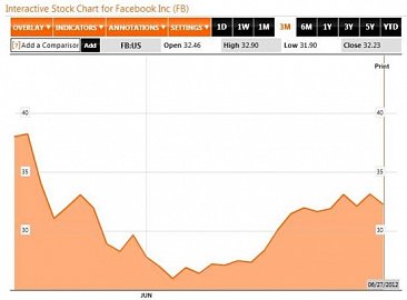 Akcie společnosti Facebook měly těžké první týdny obchodování. Jejich debut byl poznamenán technickými závadami na ryze elektronickém burzovním trhu NASDAQ (National Associaton of Securities Dealers Automated Quotations), což bylo zdůvodněno přetížením systému (já sám čekal na zahájení obchodování u grafu 18. května 2012 v 17 hodin CET, ale nic se několik desítek minut nedělo) a zprávami, ve kterých analytici prognózovali snížení výnosů a zisku, a to jen pár dnů před zahájením obchodování. Cena akcií vystoupala až k 45 dolarům, ale první obchodní den zakončily v plusu pouze 23 centů. V následujících dnech a týdnech však cena akcií klesla až na úroveň 25,52 dolarů, což představuje cca 33% propad pod úvodní prodejní cenou na úrovni 38 dolarů. Někteří obchodníci se domnívají, že cena neklesla pod úvodní prodejní cenu první obchodní den především díky masivní podpoře investičních bank a nastavenou úvodní cenu považují již od počátku za nadhodnocenou. Současná hodnota cen akcií společnosti Facebook se pohybuje v rozmezí 32 – 33 dolarů, viz graf níže.