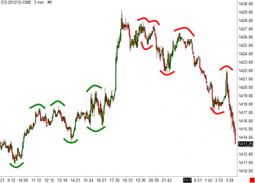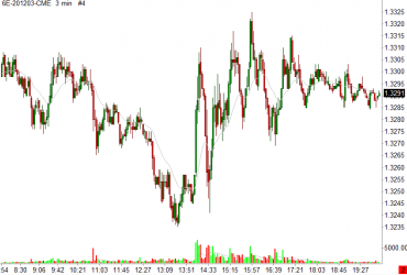 Ukázka zobrazuje 3minutový intradenní graf trhu měnového páru EUR/USD. V první polovině grafu je zobrazena jinak poměrně poklidná dopolední seance po otevření burzy v Londýně. Naproti tomu odpolední seance je provázena vyhlášením důležitých ekonomických dat a zasedáním ECB, což se obvykle projeví právě na zvýšené volatilitě a nervozitě obchodníků.
