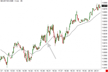Ukázka klouzavého průměru na 3minutovém grafu futures trhu britské libry. Na tomto příkladu je hodnota klouzavého průměru vždy počítána z 34 předchozích cen jednotlivých úseček. Klouzavý průměr pomáhá snáze identifikovat převládající směr trhu. Průměrná cena také tvoří velmi často určitou S/R úroveň a nabízí zajímavé obchodní příležitosti.