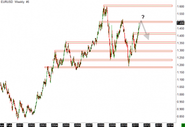 Ukázka týdenního grafu (Weekly) trhu EUR/USD s vyznačením významných support/resistance úrovní. Ty představovaly určitou bariéru v cenovém vývoji v historii a mohou být zlomovým bodem i v budoucnu. Trh se nyní přibližuje k ceně 1500, která byla v historii právě významnou resistance úrovní. Cena 1500 může tedy být zajímavou příležitostí k prodeji. Obchodník může na této úrovni očekávat např. výskyt právě zmíněné formace dvojitý vrchol. Pomocí bližšího zkoumání chování trhu na této S/R úrovni se může rozhodnout pro případný vstup do krátké pozice.