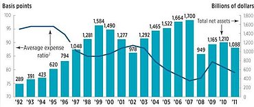 Celková čistá aktiva podílových fondů v USA k poměru nákladovosti mezi lety 1992 a 2011